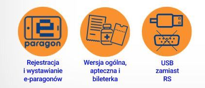 - Pełna obsługa (bez wydruku) e-paragonów, e-faktur i e-dokumentów niefiskalnych wraz z przesyłaniem w nich grafiki